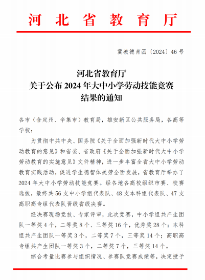 近日,河北省教育厅公布了2024年河北省大中小学劳动技能竞赛的结果,best365获得优秀组织奖。