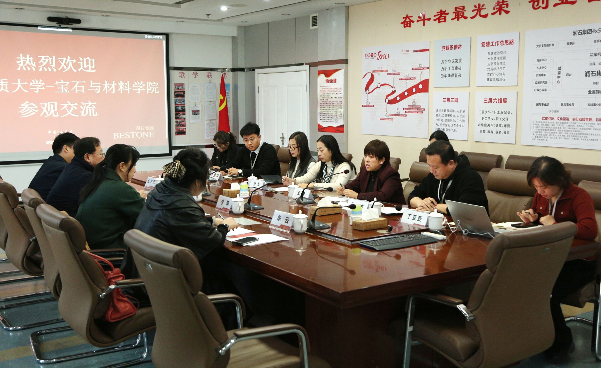 李艳代表学院对集团的热情接待表示感谢,介绍了宝石与材料学院的发展历程和学科特色,介绍了学院一流的师资队伍建设和完善的教学科研实践育人体系,培养了一批批具有国际视野、创新精神和实践能力的珠宝玉石专业人才,并认为学院的人才培养和集团的战略发展是一致的。双方就党建共建、产学研融合发展、成果转化应用、人才培养模式、学生实习选用等校企合作项目进行深入交流。