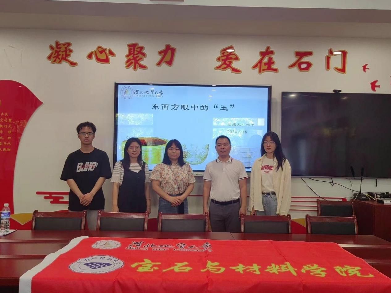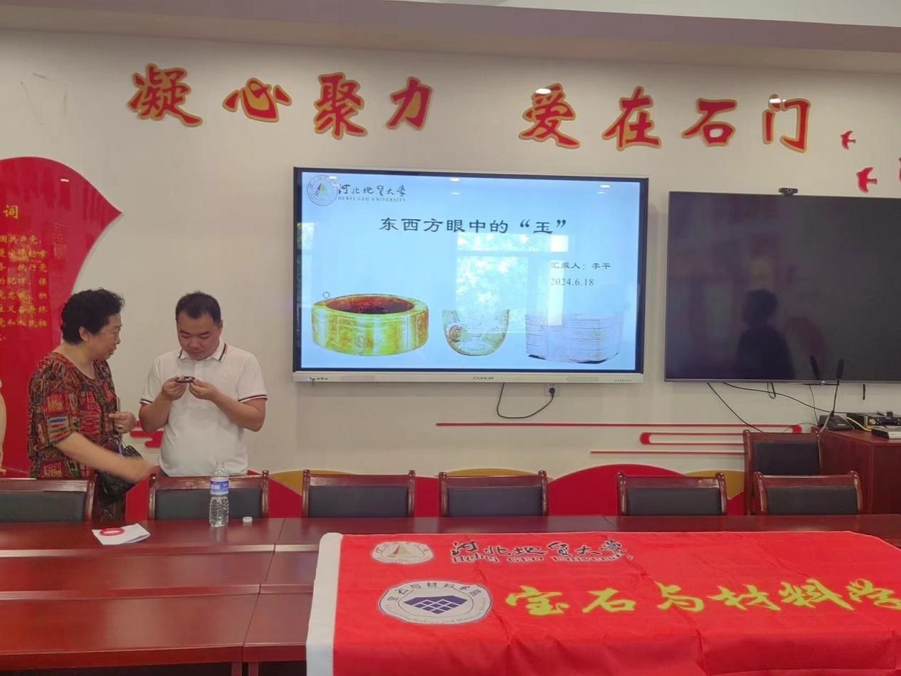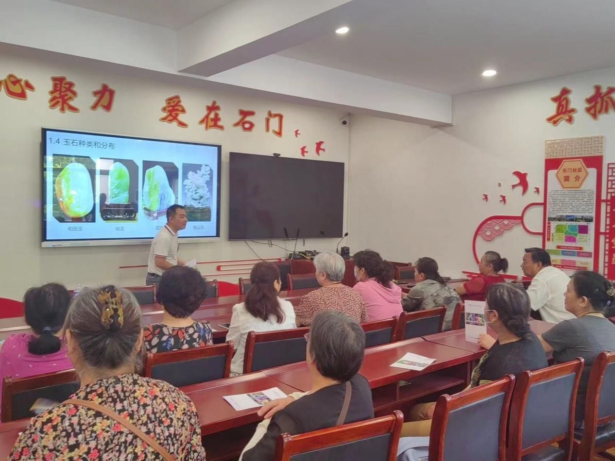 为引导青年学生在服务群众的生动实践中感知科学理论的真谛,提高社区居民的玉石鉴赏能力,宝石与材料学院团委于6月18日为签署实践结对协议的石门社区居民进行了玉石知识的科普活动,主讲为宝石与材料学院李平老师,参加活动的有宝石与材料学院团委书记边泓旭、学生干部代表晏江柔、李向婷、龚铭,以及石门社区中心党委副书记、居委会副主任宋红霞、杨会永和石门社区的居民代表们。