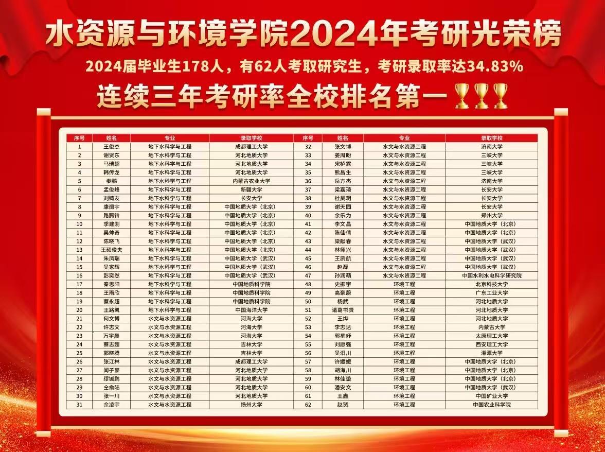 研究生入学考试逐渐成为当下大学生追求学术深造和职业发展的重要途径。best365足球官网水资源与环境学院高度重视学风建设,历年来通过朋辈引领、考研经验交流会等活动积极动员学生考研、为大家提供宝贵经验,近三年分别以考研率29.61%、32.72%、34.83%的成绩连续斩获第一名。