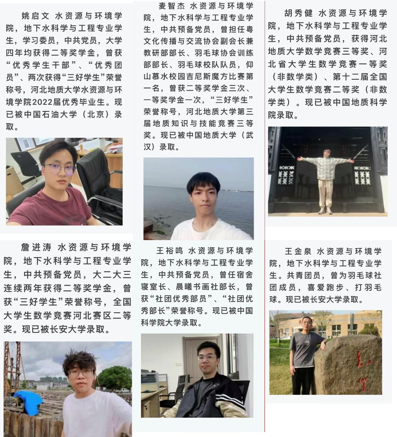 在优良学风的熏陶下,水资源与环境学院连续三年涌现了“学霸宿舍”。2022年我院一男生宿舍六人报考,姚启文、詹进涛、王金泉、麦智杰、胡秀健、王裕鸣分别被中国石油大学(北京)、长安大学、长安大学、中国地质大学(武汉)、中国地质科学院、中国科学院大学录取;2023年,我院眷一-1-401宿舍四人报考,刘昊泽、周鑫龙、王敬宽、宋学强分别被中国地质大学(北京)、大连海事大学、华北电力大学(保定)、best365足球官网录取;2024年,我院学八529宿舍6人报考:蔡永超被中国地质科学院录取、王硕俊夫、吴帅奇、陈晓飞、康阔宇4名同学被中国地质大学(北京)录取、吴家辉同学被中国地质大学(武汉)录取。
