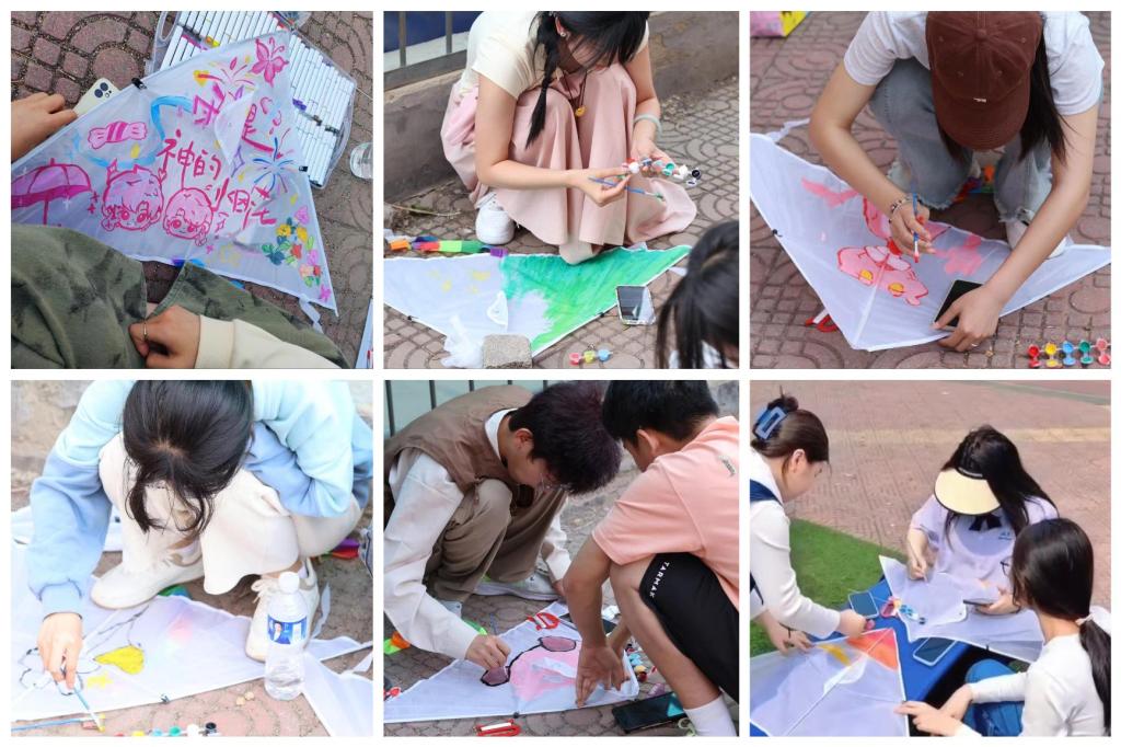 活动开始前,有很多同学结伴而来,迫不及待地等待领取小风筝。率先拿到风筝的同学围坐一圈,伴随着操场上悠扬的音乐,拿起画笔,将心中的创意与想法绘于风筝之上。同学们有的画下了学校美丽的风景,让人感受到生机勃勃的力量;有的用画笔写下“上春山”几字,寓意对春天的美好新生活的向往;有的写下祝福,将美好祈愿放飞天空。热闹的场面还吸引了许多在操场玩耍的小朋友,他们用独有的奇思妙想在风筝上画上彩色的汽车、可爱的卡通人物以及色彩斑斓的花草,一派欣欣向荣的春日景象跃然于风筝之上。