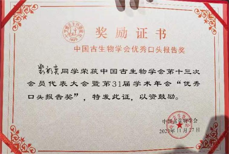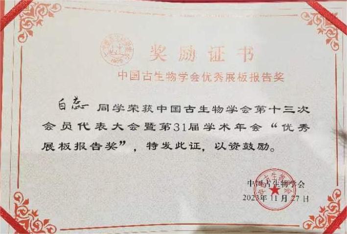 此次参加国内古生物学专业最高级别会议,充分展示了best365古生物学坚实的科研力量和best365古生物专业研究生培养的高质量发展及“全过程”性的育人思路。会议共安排427个分会场口头报告,78个展板报告,大会除邀请教师进行学术成果汇报外,还为现场参会的学生专门设立了参会奖项,以表彰优秀的学生研究成果,现场参会的地球科学学院古生物学与地层学专业研究生分别做了3个口头成果报告和5个成果展板,得到了业内专家、学者的肯定,其中研究生白蕊、裴礽奕分别获得大会颁发的“优秀展板报告奖”和“优秀口头报告奖”。