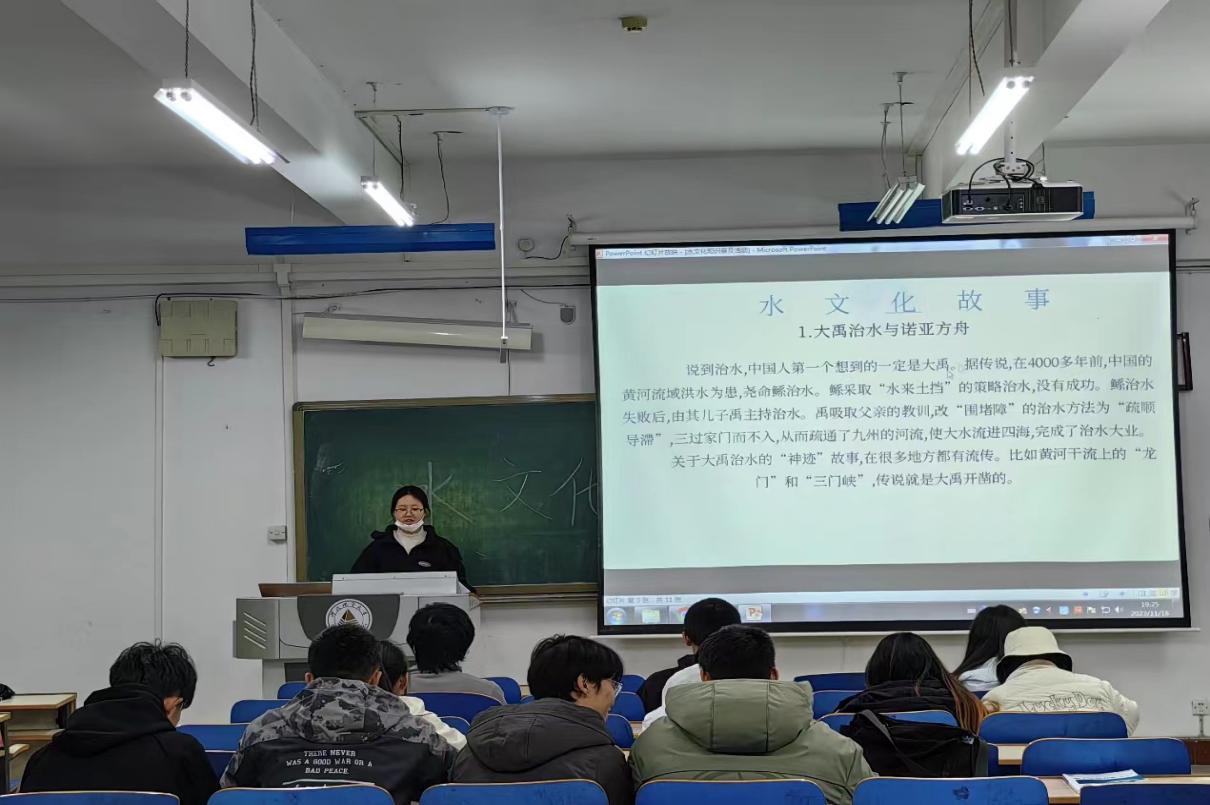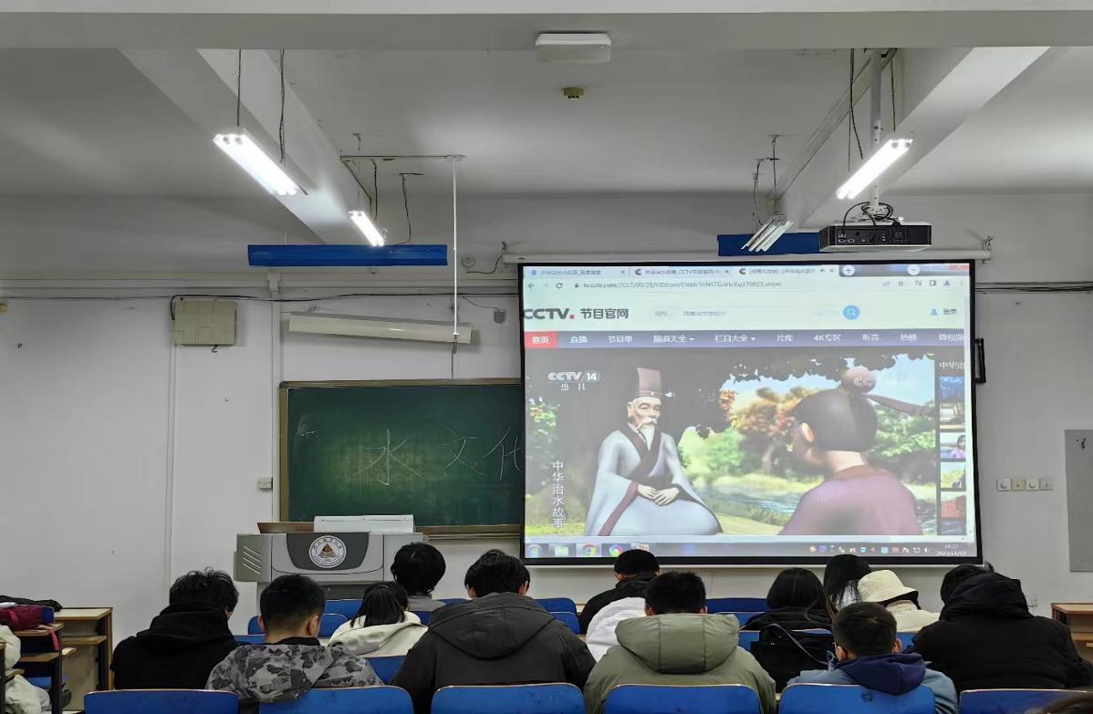 彭家栎同学首先向同学们介绍物态水文化、制度水文化、精神水文化等不同层面的水文化概念,活动负责人通过分享《中华治水故事》、《大禹治水》、《李冰与都江堰》、《隋唐大运河》、《孙叔敖与芍陂》以及《邗沟的故事》等视频资料,向同学们讲述中华民族治水故事,感受中华民族的历史文化,激发大家的民族自豪感。