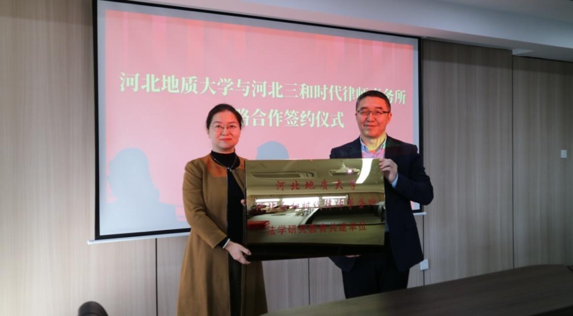 侯丽艳与常树民代表学校与律师所签署了“实践教学基地协议书”,马沁芳代表学校颁授“法学研究教育共建单位”牌匾。侯丽艳向法政学院聘任的客座教授常树民、赵伟、秦辉、卢海国、周立炳、牛军利等颁发聘书。双方与会人员就相关合作事宜的开展及深化合作交流进行座谈。