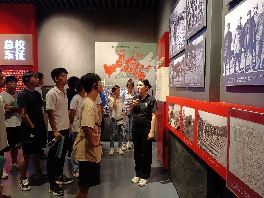在抗大陈列馆,同学们在序厅学习毛泽东同志为抗大制定的教育方针和校训;在主题厅了解抗大四个时期的历程:从陕北创建时期毛泽东《实践论》《矛盾论》在抗大传播讲解第一课,经过总校约5000人合编向敌后战区的东征,到达邢台浆水办学期间隆重举办纪念建校5周年活动、进行反围剿大扫荡,再到战略反攻阶段返回陕北绥德时期,筹办东北军政大学、开展轰轰烈烈的整风运动与声势浩大的大生产运动。抗大及抗大分校培养了大批军政干部、军事教育和国防教育人才,很多在新中国成立后成为政治、经济、文教、科技、交通、外交等行业的骨干人才;在今日前南峪展厅,抗大精神为当地应对灾情建设、脱贫建设以及乡村振兴中发挥着重要作用。抗大所锤炼和锻造的以坚定正确的政治方向、理论联系实际和艰苦奋斗的政治本色为主要内容的抗大精神,给同学们上了一堂生动的爱国主义教育和革命传统教育的思政课。