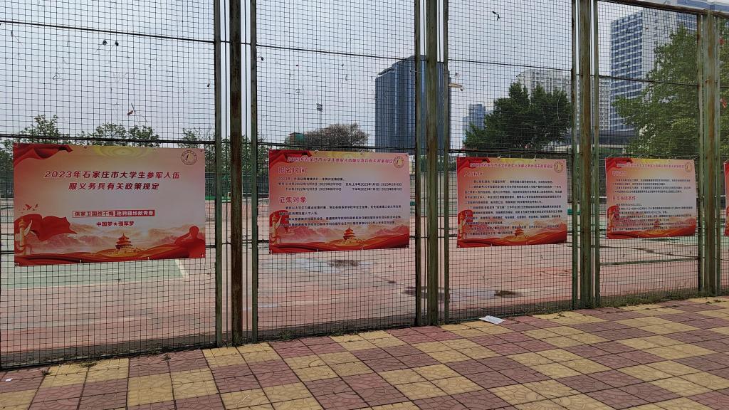 学生工作处制作了2023年石家庄市大学生参军入伍服义务兵有关政策规定的宣传展板,详细介绍了报名时间、征集对象、入伍程序、年龄条件、基本身体条件、政治考核标准、经济待遇、发展前途和咨询举报方式等政策,悬挂在慧馨园西侧甬道明显位置,便于学生查看。