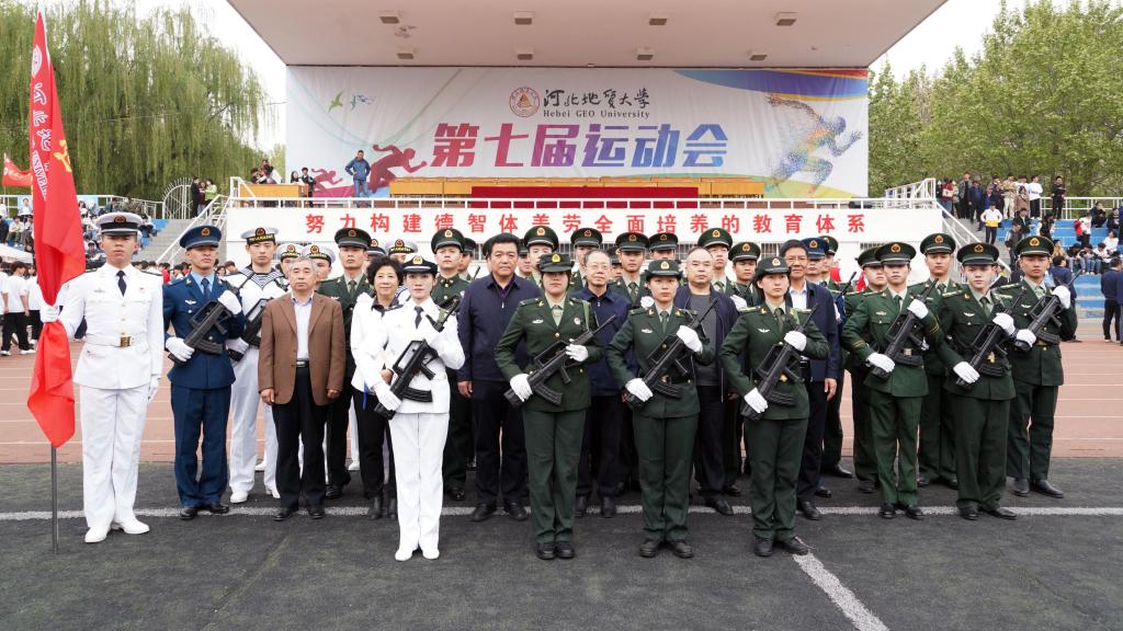 出席运动会的校领导与退役大学生士兵方队合影