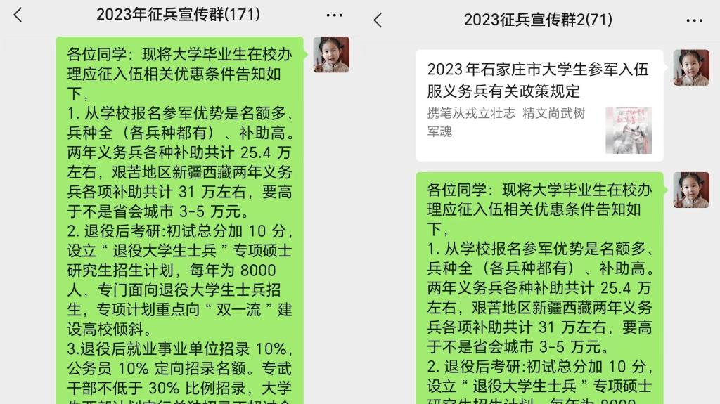 学生工作处利用2023年征兵宣传微信群发布征兵宣传信息