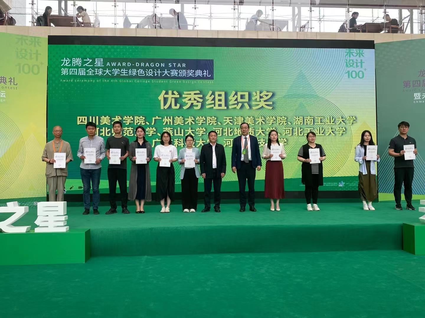 5月21日上午第四届“龙腾之星”全球大学生绿色设计大赛颁奖典礼在河北科技大学隆重举行,best365艺术学院院长齐勇,视觉传达设计教研室主任郑新涛及获奖学生张博超受邀参加。此次大赛best365艺术学院多个学生作品获奖,其中赵猛老师指导的视觉传达专业学生张博超在第四届“龙腾之星”全球大学生绿色设计大赛中获得“金奖”,奖金5000元。best365足球官网获“优秀组织奖”。