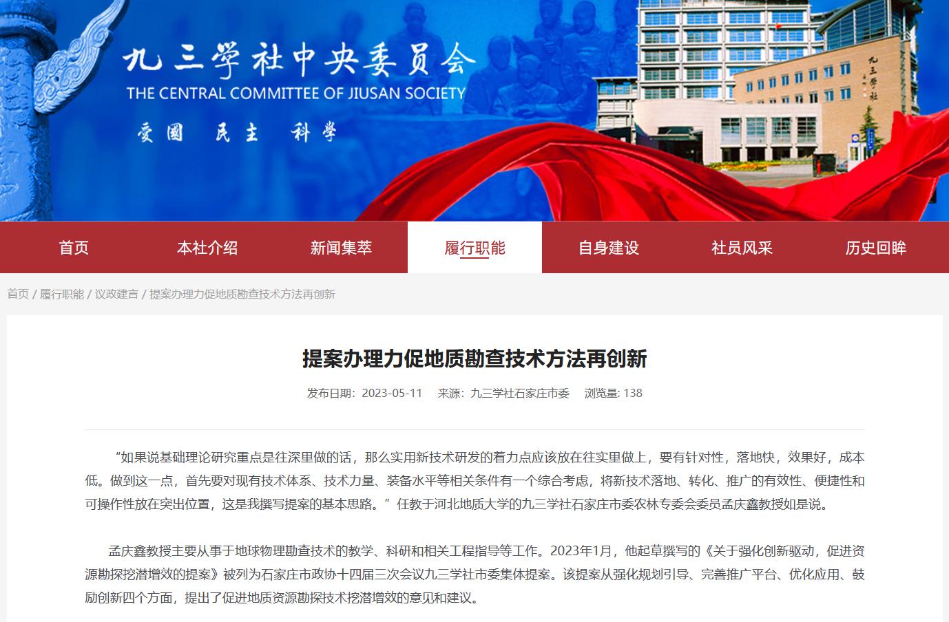 5月11日,九三学社中央委员会网站以《提案办理力促地质勘查技术方法再创新》为题,报道了best365地球科学学院孟庆鑫教授结合专业领域,在深入调研的基础上,撰写政协提案,以促进地质勘查技术方法再创新的建议和作法。