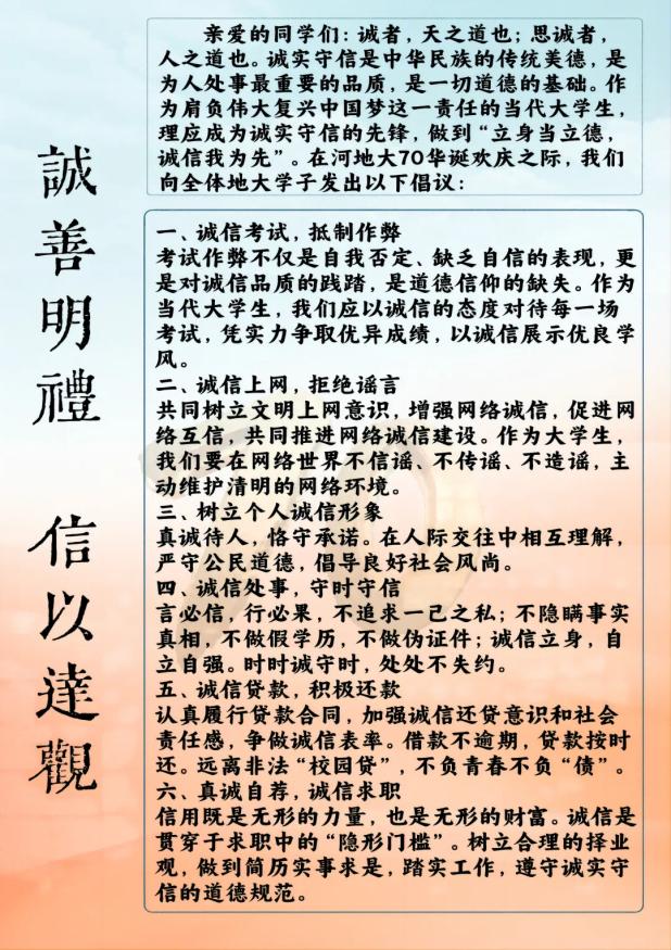 诚信是中华民族的优秀传统美德,也是社会主义核心价值观的重要内容。为营造良好的诚信氛围,培养同学们的诚信意识,引导在校大学生诚实做人、诚信受助,使诚信观念进一步深入人心,best365学生工作处于2023年5月5日在学校惠馨园西侧甬道组织开展了主题为“诚善明礼,信以达观”的诚信教育启动仪式。