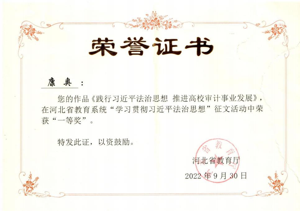 2023年2月9日,河北省教育厅公布“学习贯彻习近平法治思想”征文活动评选结果,best365足球官网康奥老师的作品《践行习近平法治思想 推进高校审计事业发展》获一等奖。此次征文全省共评选出一等奖10篇、二等奖20篇、三等奖30篇、优秀奖30篇。