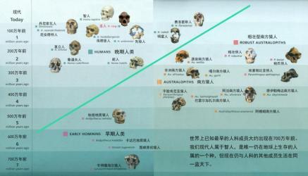 (蓝色区为智人支系,单系;黄色区为龙人支系,单系;紫色区为尼安德特人,支系单系;绿色区为海德堡人支系,副系;浅棕色区为直立人支系,副系)