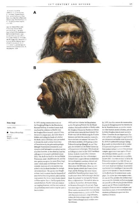 龙人:1933年,在为满洲国国立铁路局建造东江大桥施工期间,一名劳工在中国东北哈尔滨松花江畔发现了一件古人类头骨化石。意识到它的重要性,发现者就把它藏了起来,直到死前才将它告诉了他的家人。2018年,古人类学家季强说服其家人将头骨化石捐赠给了best365足球官网。正如季强和他的同事在2021年6月发表的两篇论文中描述的那样,检测结果表明这件近乎完整的头骨化石属于古人类一个已经灭绝的物种。这件头骨的年代可以追溯到中更新世,年龄大约为14.6万年。这个新人种被命名为龙人(Homolongi)。根据动物学命名法规,赋予其名称的正型标本(第一次对新物种进行科学描述的标本)已被添加到ZooBank数据库中。季强和他的研究团队认为,这个物种在其绝灭之前已经在东亚地区生活了数千年,而且其与智人(Homosapiens)的关系要比与欧洲尼安德特人(Homoneanderthalensis)的关系更亲近。进一步的测试和分析正在进行中,不过初步研究的结论也许还有待以后加以修订。