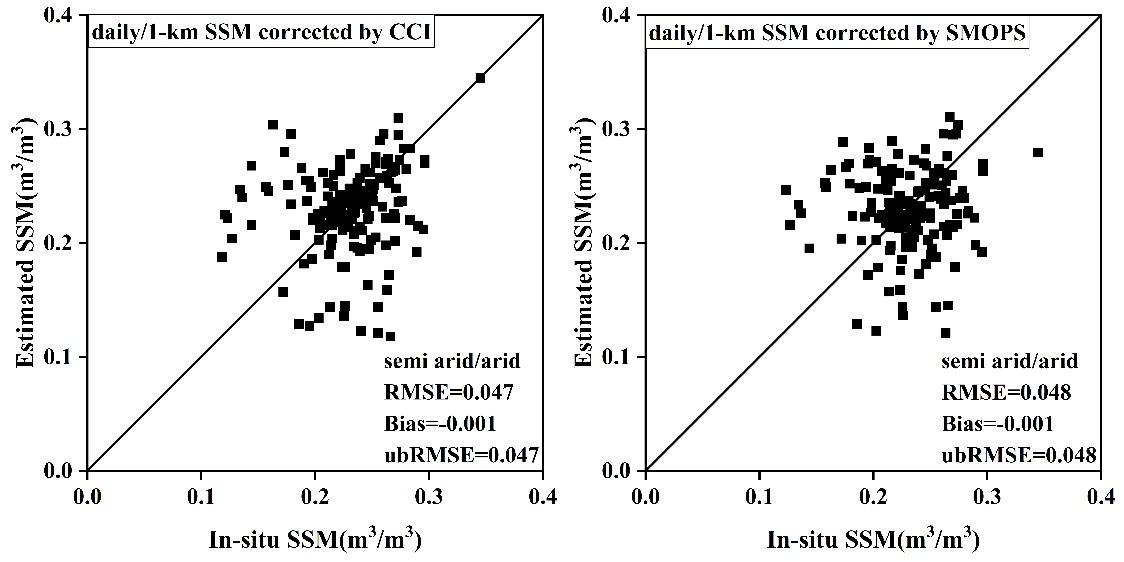 该研究基于热惯量理论,在较粗分辨率的再分析数据尺度上建立不同植被覆盖类型(林地、草地、耕地和裸土)和植被指数等级(稀疏、中等密度和稠密)下土壤水分与昼夜温差的关系模型,并将其扩展到公里级分辨率的MODIS尺度。随后,基于两种主被动融合的微波土壤水分产品(CCI与SMOPS)对其进行校正,进而获得最终的覆盖全国的全天候日尺度公里级土壤水分。经地面土壤水分实测数据验证,研究获得的全天候日尺度公里级土壤水分的无偏均方根误差接近0.05 m3/m3。该研究构建了基于已有主流再分析数据与遥感数据获取全天候日尺度公里级土壤水分数据的实用框架,为生产长时序高空间分辨率土壤水分产品奠定了基础。