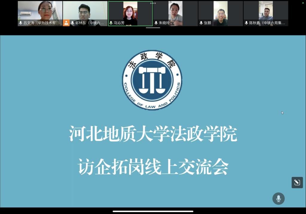 为持续推进毕业生顺利就业、充分就业、高质量就业,法政学院继续开展“访企拓岗促就业”企业走访专项活动。8月2日,法政学院党委书记马沁芳、党委副书记朱晓玲、辅导员张颢线上走访了中铁六局集团有限公司建筑安装分公司、中铁六局集团有限公司北京铁路建设有限公司和华为科技有限公司。法政学院优秀毕业生,中铁六局集团有限公司建筑安装分公司法律合规部郭林东、中铁六局集团有限公司北京铁路建设有限公司法律合规部陈秋鑫、华为科技有限公司人力资源招聘专员吕文涛参加座谈。