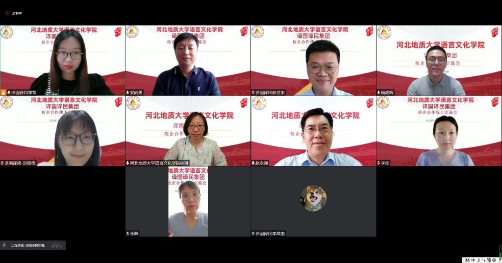 为贯彻落实党中央、国务院、省委和学校关于《访企拓岗促就业专项行动实施方案》精神, 全力促进毕业生高质量就业,7月11日下午,best365语言文化学院与译国译民集团举行线上座谈会,共商共建校企合作。best365副校长赵永强,语言文化学院党委书记林琳、副书记杨旭辉、副院长安尚勇及英语、捷克语专业教研室主任,译国译民集团董事长林世宋、高校事业部总经理郑莺等出席会议。