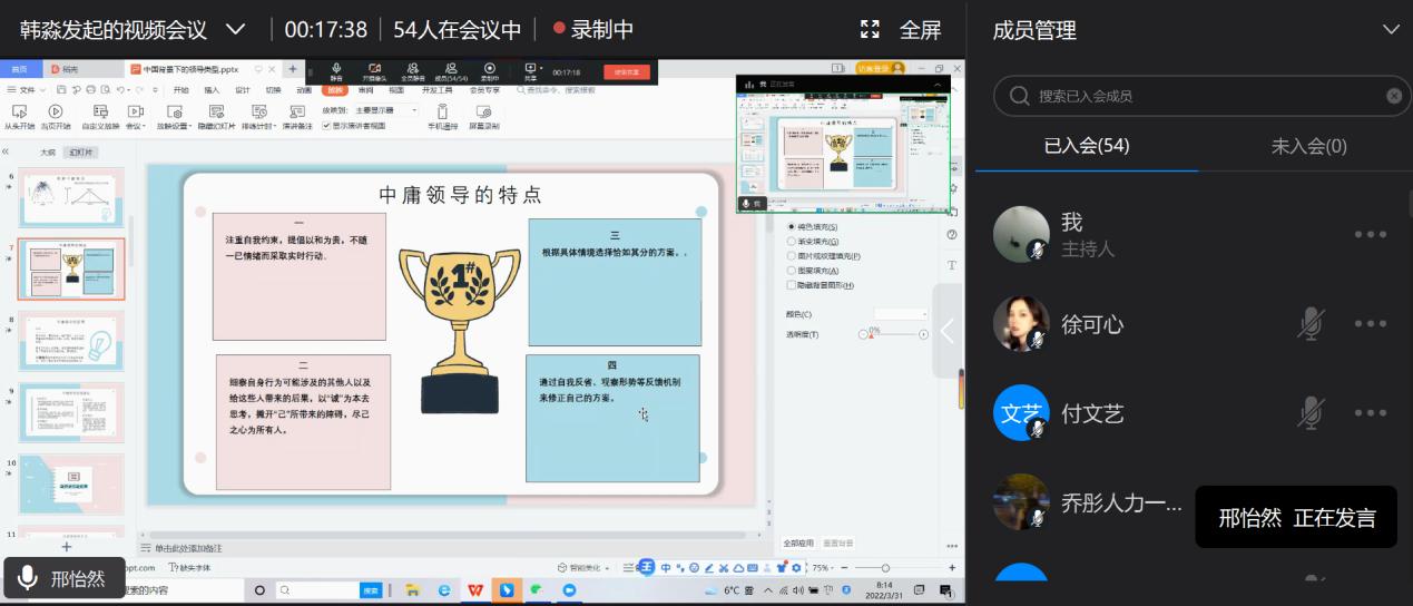 人力资源管理教研室韩淼老师在开展《领导科学与艺术》课程的线上教学时,在进行基本概念和理论知识的讲授后,就由学生自由结合分组对老师选定的主题内容进行研讨。其中,有一节内容特意选择了“中国背景下的领导”作为主题,让学生理解领导力在中国和西方社会中的差异,了解在中国情境下的领导力特色,从而增强文化自信。