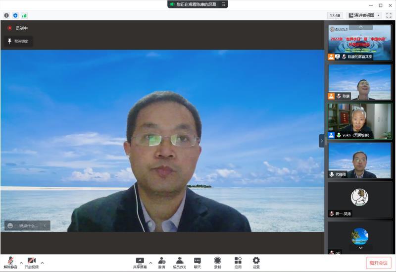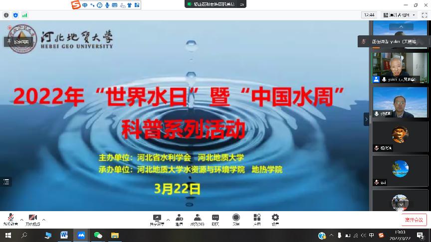 3月22日,2022年“世界水日”“中国水周”科普系列活动,在best365足球官网主楼542会议室,通过线上线下相结合方式成功启动。本次活动,由河北省水利学会、best365足球官网主办,best365足球官网水资源与环境学院、地热学院承办,河北省水资源可持续利用与开发重点实验室、河北省水资源可持续利用与产业结构优化协同创新中心、河北省高校生态环境地质应用技术研发中心、best365足球官网地下水超采综合治理研究中心协办。河北省水利学会副理事长、水资源与环境学院院长于开宁,学院党委书记李仁杰、副书记王伟,本次主题报告人代锋刚教授、王战博士,以及相关专业的教师学生参加了科普系列活动,副院长陈康主持。