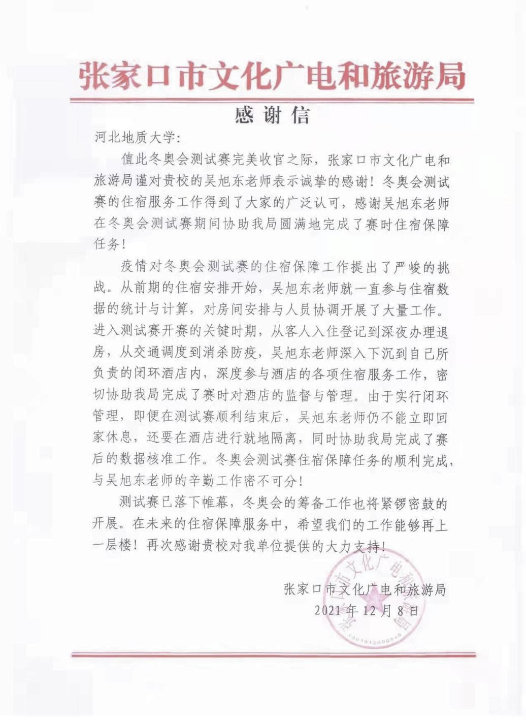 11月21日,测试赛进入关键阶段,吴旭东老师为确保运动员能够及时进行核酸检测和参与比赛,努力在防疫、卫生、交通、竞赛、安保等各领域人员之间积极沟通。同时,协助酒店与外宾沟通,让参赛人员感受到酒店轻松温馨的气氛、细致到位的服务。世界杯结束后,她凭借优异的表现、极高的工作热情获得了张家口市副市长闫利艳市同志和张家口市文化广电和旅游局书记冀晓东同志的一致肯定,并得到了继续服务洲际杯赛事的指令。