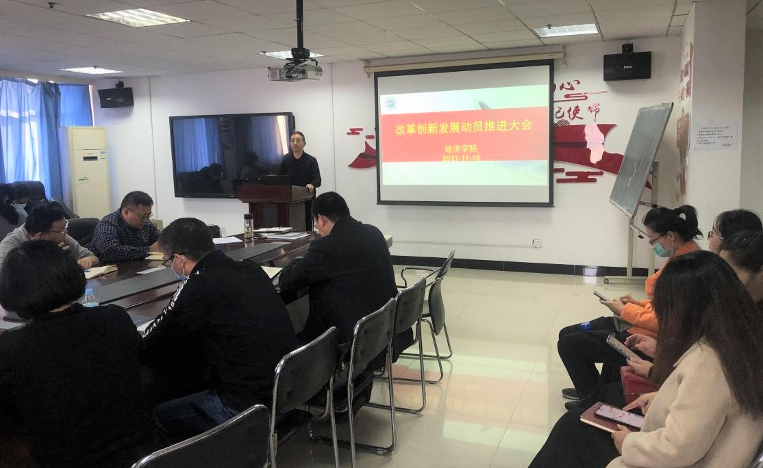 11月18日,经济学院在综合楼806召开改革创新发展动员推进大会,会议的主题是:认真学习贯彻党的十九届六中全会精神 推动学院改革创新发展。会议分两个阶段,第一个阶段由经济学院院长牛建高向全体老师宣讲党的十九届六中全会精神;第二个阶段,由牛建高解读学院近期制定的相关文件政策。党委书记李国柱、党委副书记赵明、学院党委委员及全体教职工参加了此次会议。会议由牛建高主持。