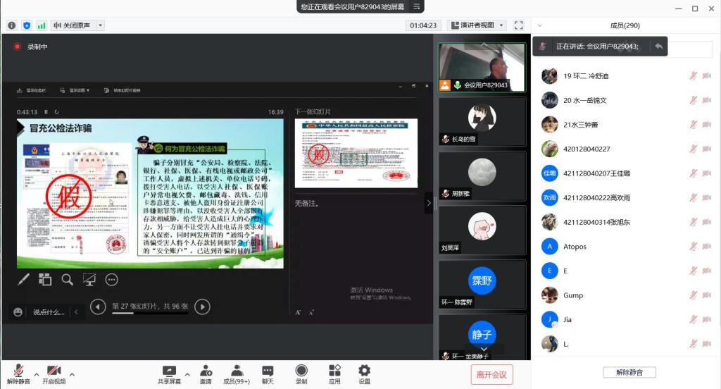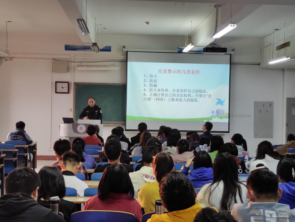讲座中,胡警官首先从防火、防盗、防骗、防人身伤害等多维度安全方面向学生进行了讲解,又着重、系统地从什么是电信诈骗、为什么会上当、常见的电信诈骗手段、应对策略及上当后的补救措施等方面向学生们介绍防骗常识,提高学生识骗防骗能力。胡警官通过列举和剖析发生在大学生身边的真实诈骗案例,生动形象地讲解和细致分析了骗子行骗的常用伎俩及大学生容易上当受骗的主客观原因,并反复叮嘱学生们要树立反诈骗意识,财产安全意识,切忌贪小便宜;遇事保持冷静,一旦被骗,尽力掌握对方的有罪证据并迅速报警,切实维护好自身的合法权益。