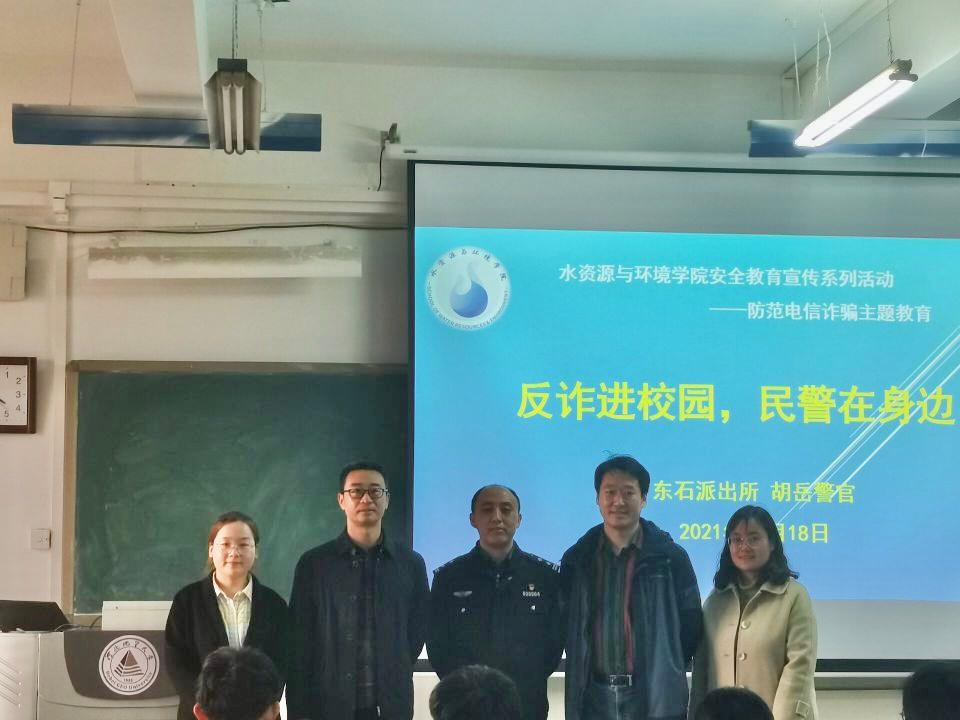 为提升学生防范意识,切实增强学生电信网络防诈骗辨识能力,11月18日下午,水资源与环境学院邀请石家庄市东石派出所胡岳警官,通过线下现场授课和线上腾讯会议相结合的形式面向全院学生开展“反诈进校园,民警在身边”主题教育活动。校安全工作处副处长赵洋,水资源与环境学院党委副书记王伟,学生辅导员付志静、马宇帆参加此次活动。