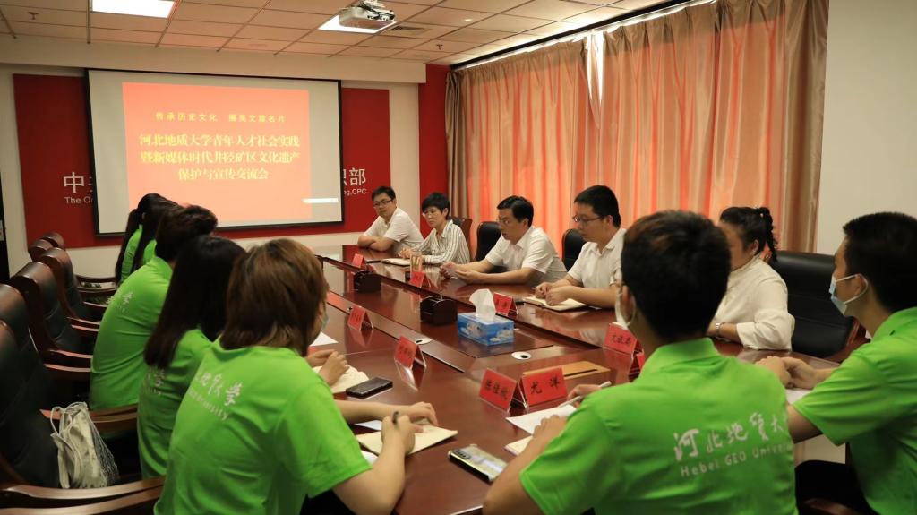 齐正进部长对同学们的到来表示了热烈欢迎,并向同学们介绍了矿区发展历史和红色文化,使同学们对井陉矿区有了深入的了解。小分队带队教师郑慧向井陉矿区参会领导详细介绍了本次社会实践的实践方案,并与各位领导详细探讨了整体活动流程。期间,向小分队成员播放了井陉矿区宣传片,并向小分队成员赠送了第五届石家庄市旅游产业发展大会的相关活动视频。