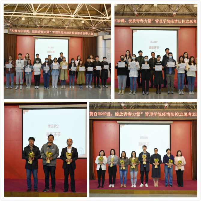 4月24日,管理学院在科技报告厅举办“礼赞百年华诞 绽放青春力量”疫情防控志愿者表彰大会。校团委书记郭雅洁,管理学院院长王汉新、党委书记袁志忠、副书记初汉芳、副院长冯丽丽、彭永芳以及志愿者师生代表参加了表彰大会。
