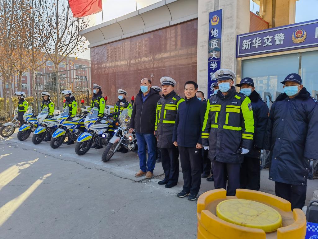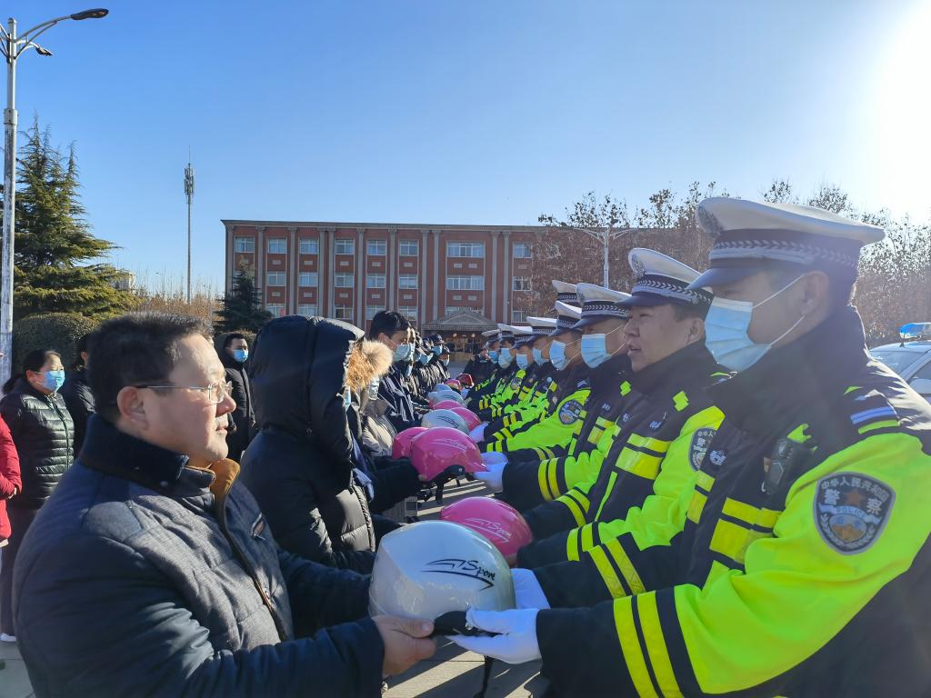 12月30日下午,新华交警大队冒着严寒专程来到北校区,向教职工赠送头盔。在赠送仪式上,新华交警大队副大队长孙杰、辖区中队队长张向明及警员同志们与best365高等职业技术教学部领导、部分教职工共同启动了“送安全、送头盔、送温暖”活动。