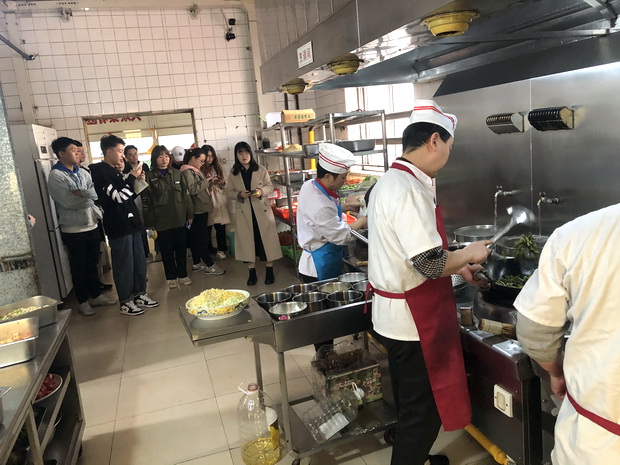 座谈会后,同学们深入食堂第一线,兴致勃勃的参观了米饭生产线和各餐厅的后厨操作间,观看了厨师们烹制菜肴的厨艺,还参观了食材库房等重要场地。在参观过程中,工作人员与同学们就大家关心的原材料采供体系、日常操作流程、餐具消毒、食品售卖及食品安全监管措施等问题进行了现场交流与互动。