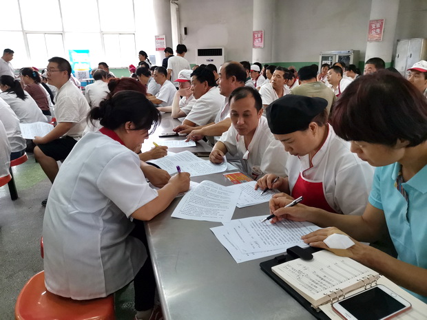 闫云龙通过《食品安全法》等法律法规,讲述了食品安全的重要性,只有熟悉和掌握好食品安全知识,才能抓好食品安全。工作中落实好食品安全主体责任,强化从业人员食品安全“底线”思维和“红线”意识,提升食品采购、加工、售卖、原材料保管等各环节服务人员的食品安全意识。不断完善和贯彻执行食品安全各项规章制度,加强从业人员食品卫生安全教育,严把食品采购关,规范食品加工销售管理,切断食源性污染和疾病的发生,以保证食品卫生安全。闫云龙详细为大家讲述了从业人员着装卫生要求、食料加工制作成品供应卫生工作流程、场所设施设备卫生要求、餐厨废弃物处置要求等内容。并通过大量的食品卫生案例和图片,再次为大家敲响了食品安全管理的警钟。培训结束,全体参训人员进行了考核测评。