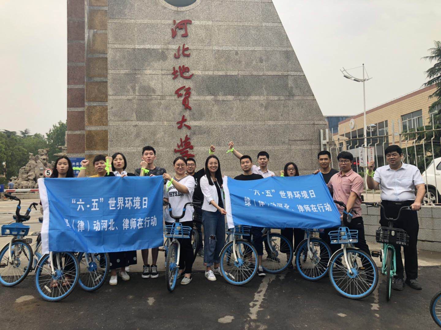 活动环节主要分为三部分,第一环节是由参与律师和同学在宣传条幅上签名并系上绿丝带;第二环节是向现场参与同学发放《简单生活倡议书》,积极宣传“绿(律)动河北、律师在行动”的简单生活理念,由现场人员共同宣读简单生活的倡议口号;第三环节是组织大家绿色骑行。市律协参与律师与法政学院志愿者们一同从best365足球官网西门出发,沿槐安东路、体育南大街骑行至世纪公园,合影留念后返还至学校。