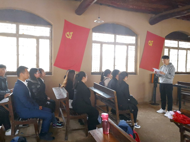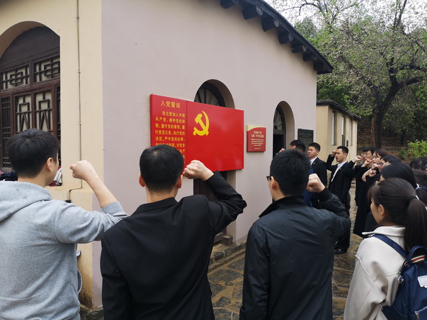 在七届二中全会会址前,支部党员们重温了入党誓词,学习了第五批全国干部学习培训教材《序言》精神。