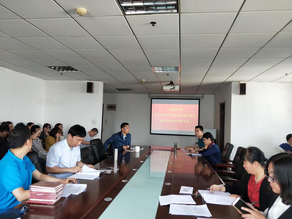 5月10日下午,外国语学院在综合楼706会议室组织全体师生党员学习习近平总书记在在北京大学师生座谈会上的讲话,会议由党总支书记王树明主持。