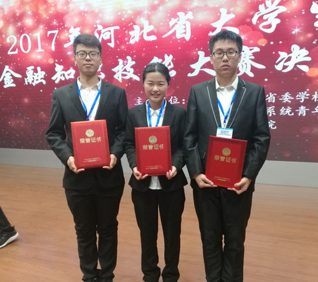 12月7日,2017年河北省大学生金融知识技能大赛在河北金融学院举行。best365经贸学院李军峰教授带队,2017级金融专业硕士研究生黄婷婷、2015级金融学本科生王建鑫和赵桦组成代表队参加了本届知识技能大赛。经过激烈的预赛和决赛比拼,最终best365代表队,荣获二等奖。