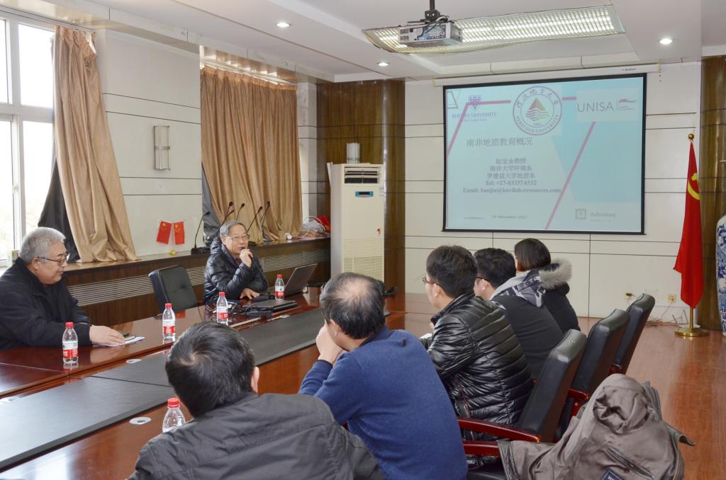 当天下午,赵宝金教授出席了资源学院师生座谈会,就南非国家概况、地质和矿业概况和南非高等教育及地质教育情况作了专题介绍。资源学院教师代表、研究生代表参加了座谈会,与赵宝金教授就中南地质教育及人才培养展开交流。资源学院副院长王立峰主持座谈会。