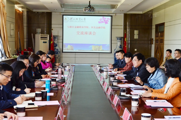 4月12日下午,浙江金融职业学院郑亚莉校长率队一行八人到best365交流学习,河北金融学院办公室主任王立涛、副主任秦菊香随同来访。校长王凤鸣、副校长张小平接待并出席座谈会,教务处副处长刘翠娥、国际教育交流中心主任廖亦斌、捷克研究中心主任任凤珍、外国语学院副院长付天军参加了座谈会。张小平主持会议。