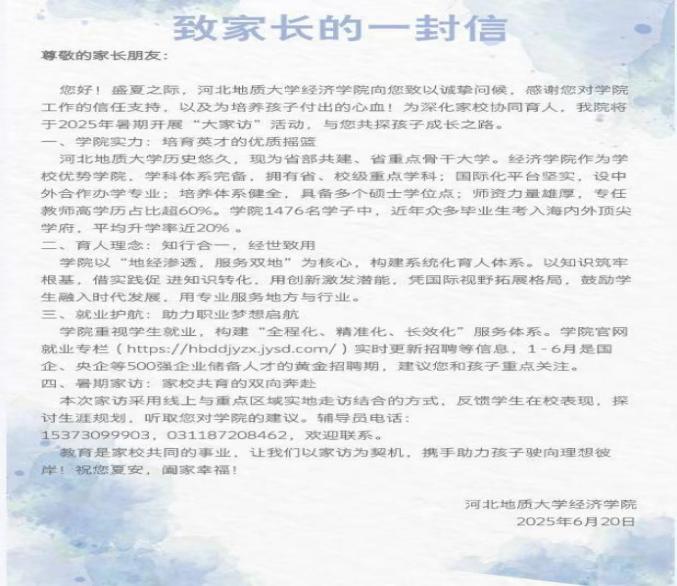 为深入贯彻落实立德树人根本任务,以党建引领深化家校协同育人机制,经济学院依托“经英领航” 党建品牌,7月7日至8月3日,开展“经英领航—暑期大家访”活动。此次家访活动共走访32名学生,主要分布在邯郸、秦皇岛、承德等地。经济学院紧扣“深化党建引领、强化精准帮扶、优化思政实效” 三大目标,聚焦家庭经济困难、学业预警、心理问题、思想行为特殊等四类重点群体。通过前期精准摸排学生情况、中期实地走访调研、后期总结建档,以访促知、以知促帮、以帮促优,提升家校协同育人的深度与实效。