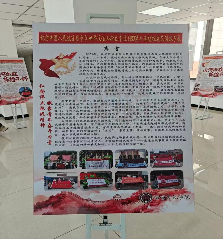此次展览的素材为学院组织学生开展“燕赵抗战民间故事寻访”社会实践活动时,学院师生冒着酷暑,赴河北各地实地收集整理的抗战民间故事。在展览筹备阶段,学院领导统筹部署各项工作;学院教师主动发挥专业优势,协助梳理燕赵抗战民间故事脉络、筛选展陈内容;院团委学生会成员积极投身现场布置,有序摆放主题展板、悬挂宣传横幅,从细节处营造庄重而浓厚的红色氛围;学院选拔的讲解员反复熟悉展板内容,精准把握每一段抗战故事的历史背景与精神内涵,力求以生动鲜活的语言传递红色记忆。学院师生从各个环节为活动顺利开展奠定了坚实基础。