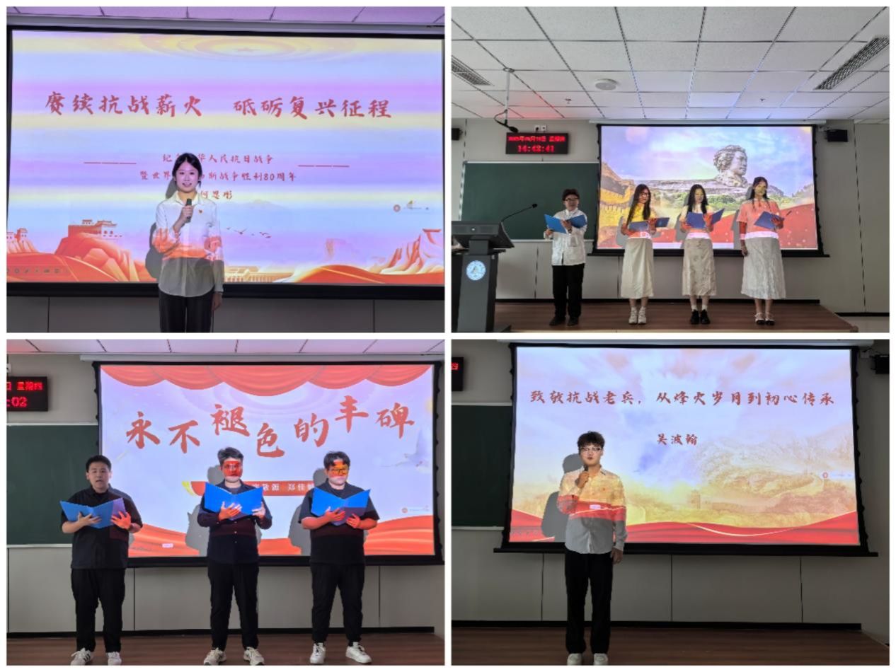 随后,来自学院各年级的同学们通过演讲、朗诵、演唱等多种形式,深情回顾抗战岁月,致敬英雄先烈。何思彤同学以《铭记历史昭日月,吾辈奋进继荣光》为主题展开演讲,情感真挚、铿锵有力;朗诵节目《跨越八十年的对话》《永不褪色的丰碑》《浴血荣光铸丰碑》等,通过声音与文字跨越时空,与英雄展开心灵对话;吴波翰、刘泓等同学的演讲深情讴歌抗战老兵的英勇事迹与初心传承;合唱《写你》则以歌声表达对和平的珍视与对未来的美好祝愿。最后,大家一同唱响歌曲《明天会更好》,清澈的合声、真挚的表情、挥动的红旗,传递出对和平的珍视、对未来的憧憬,也将现场气氛推向高潮,赢得阵阵掌声。