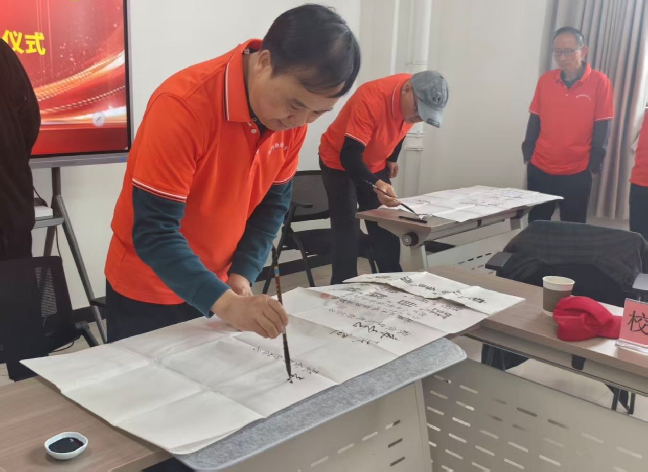 座谈会接近尾声时,现场氛围迎来又一高潮——校友捐赠书法作品。大家在校友的书法作品上依次签名,或挥毫疾书,或凝神落款,每一个签名都承载着对母校的眷恋、对同窗情谊的珍视,更饱含着对地质精神代代传承的期许。签下姓名的瞬间,仿佛将四十年的时光浓缩,让这场跨越山海的重逢,有了更具象、更深刻的纪念意义。
