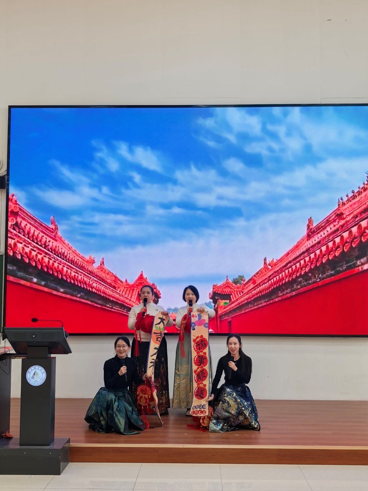 活动现场气氛热烈,合唱队伍以整齐和声演绎《我和我的祖国》《没有共产党就没有新中国》《灯火里的中国》《歌唱祖国》等曲目,铿锵节奏里满是爱党爱国的赤诚;《大中国》《团结就是力量》的嘹亮歌声,更将团队向心力融入每一个音符。独唱选手以细腻声线诠释红歌内涵,特别邀请的加拿大学者丁毅教授登台献唱《唱支山歌给党听》,字正腔圆的演唱、饱含温度的表达,让现场师生真切感受到了红色文化的跨文化感染力。