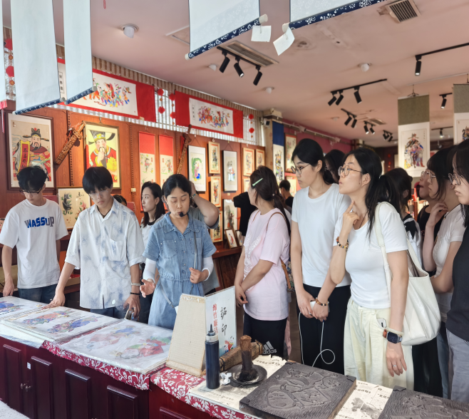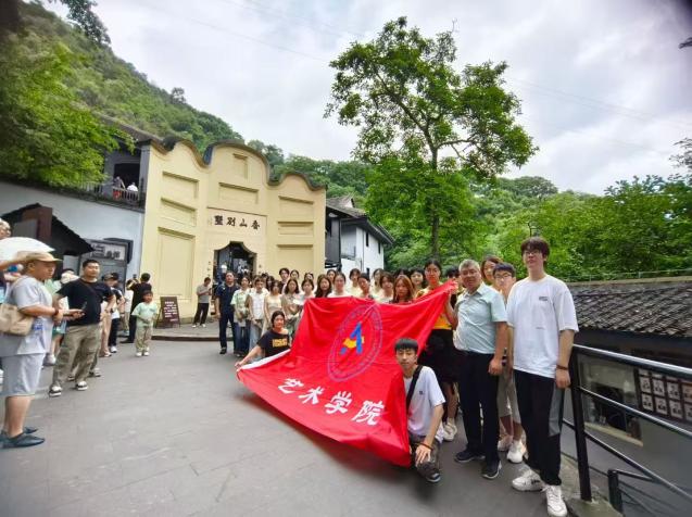 这种创新思维,在22级视觉传达设计专业的川渝之行中化为具体实践。师生们在汶川县映秀镇漩口中学地震遗址开展“传承抗震精神,践行初心使命”主题党日活动。废墟上的时钟永远停在14:28,却见证了重生的力量——遗址旁的新村,房屋抗震设计融入了地质结构原理。“设计不仅要美观,更要承载生命的重量。”同时还走进了绵竹木版年画与道明镇竹艺村,在传统技艺中挖掘设计灵感。在绵竹木版年画传承基地,同学们见证了非遗传承人刻板、印刷到彩绘等工序,色彩鲜艳、造型夸张的年画作品,蕴含着深厚的民俗文化内涵,让同学们惊叹于传统手工艺人的精湛技艺。同学们通过学习尝试将传统年画的图案元素、色彩搭配运用到现代视觉设计中,探索传统文化的创新表达路径。