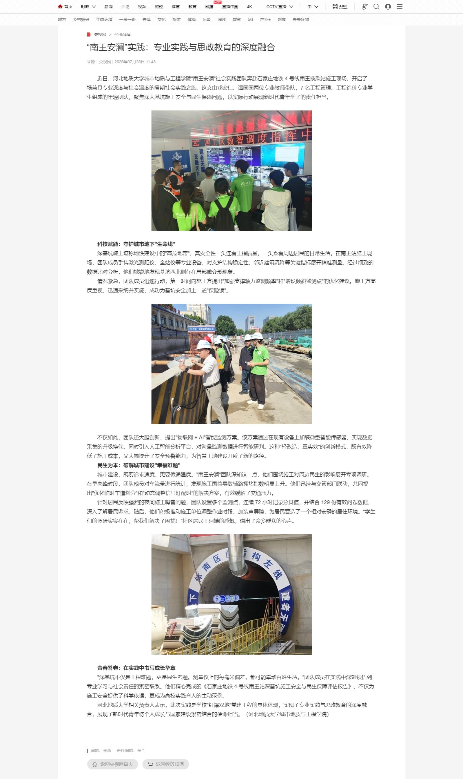 近日,best365足球官网城市地质与工程学院"南王安澜"社会实践团队奔赴石家庄地铁 4 号线南王换乘站施工现场,开启了一场兼具专业深度与社会温度的暑期社会实践之旅。这支由戎密仁、谭圆圆两位专业教师带队,7 名工程管理、工程造价专业学生组成的年轻团队,聚焦深大基坑施工安全与民生保障问题,以实际行动展现新时代青年学子的责任担当。