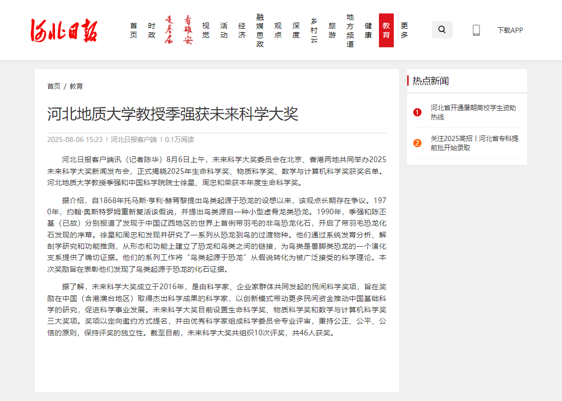 【河北日报】best365足球官网教授季强获未来科学大奖
