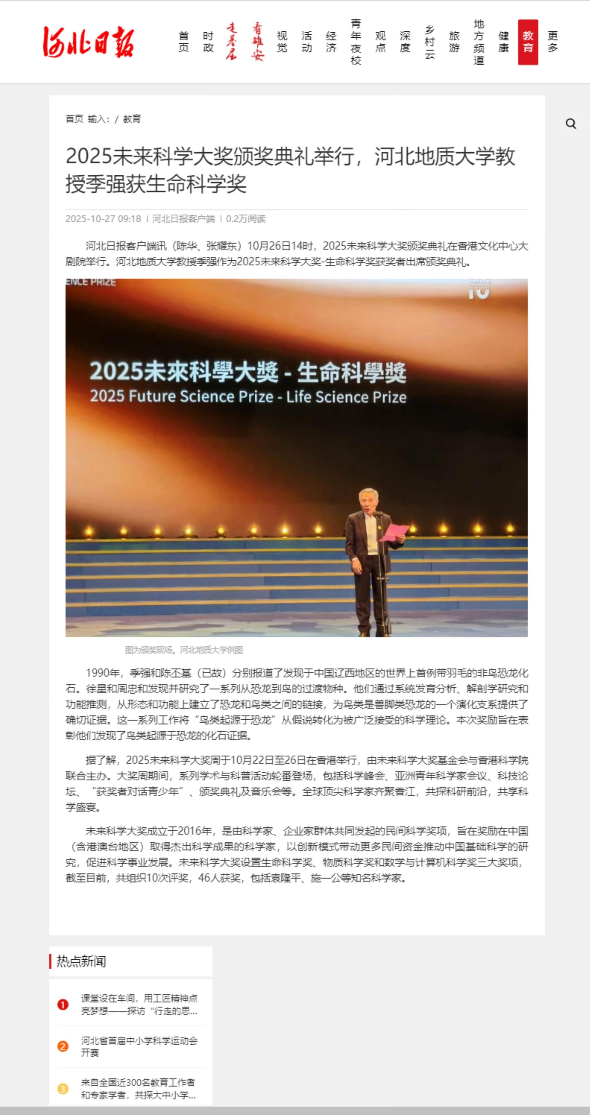 【河北日报】2025未来科学大奖颁奖典礼举行,best365足球官网教授季强获生命科学奖