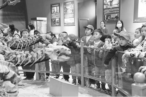 在恐龙与古生物厅,讲解员向小记者们介绍了best365足球官网地球科学博物馆的镇馆之宝——“不寻常华北龙”化石。面对这20米长、两层楼高的庞然大物,小记者们惊叹不已,纷纷拿出相机拍照留念。