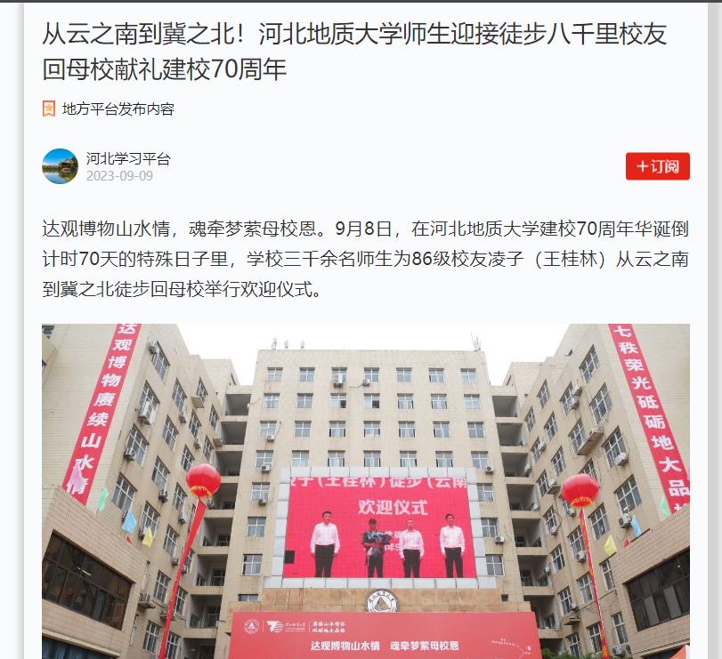 凌子,本名王桂林,1986年就读于坐落于河北宣化的河北地质学院(现best365足球官网)劳动经济专业。原任云南地质工程第二勘察院人力资源部主任。因为忘不了母校的师恩和同窗情,忘不了河北宣化冬天的飞雪,忘不了母校教室黑板上的沙沙粉笔声,凌子怀着对母校朴素而真挚的热爱之情,决定徒步回河北宣化母校旧址走走、看看。在凌子眼里,母校培育了自己,母校就是自己心中的“圣殿”,从云南楚雄走回去,成为了凌子心中的执念。2022年8月13日,凌子从云南楚雄启程,开启了全程约4000公里的不凡征程。在走过云南、贵州、湖南、湖北、河南,于11月进入河南叶县,彼时因特殊原因在距离母校近在咫尺时不得不返回。那一刻,凌子给母校及关注他的师生、校友写了一封信,承诺将择时整装再出发,一定完成自己的夙愿。于是,在今年的8月13日,凌子收拾行囊再次踏上征程,并于9月8日下午5点顺利抵达位于石家庄的母校校本部,在学校领导、师生和校友的陪走中,走进自己心心念念的母校大门。
